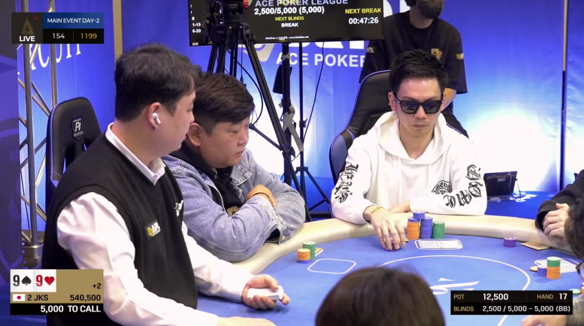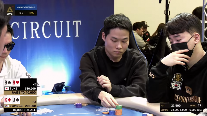 제일먼저 흰색 후드의 JKS선수가 99로 레이즈를 합니다 사이즈는 10,000칩