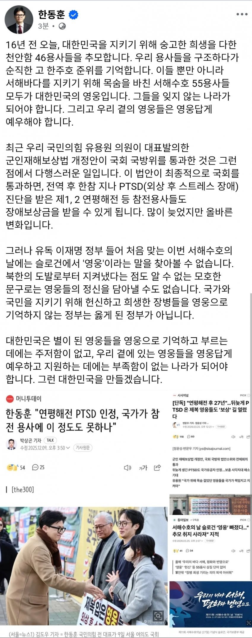 - 한동훈 페북, 영웅들을 영웅답게 예우•지원해야