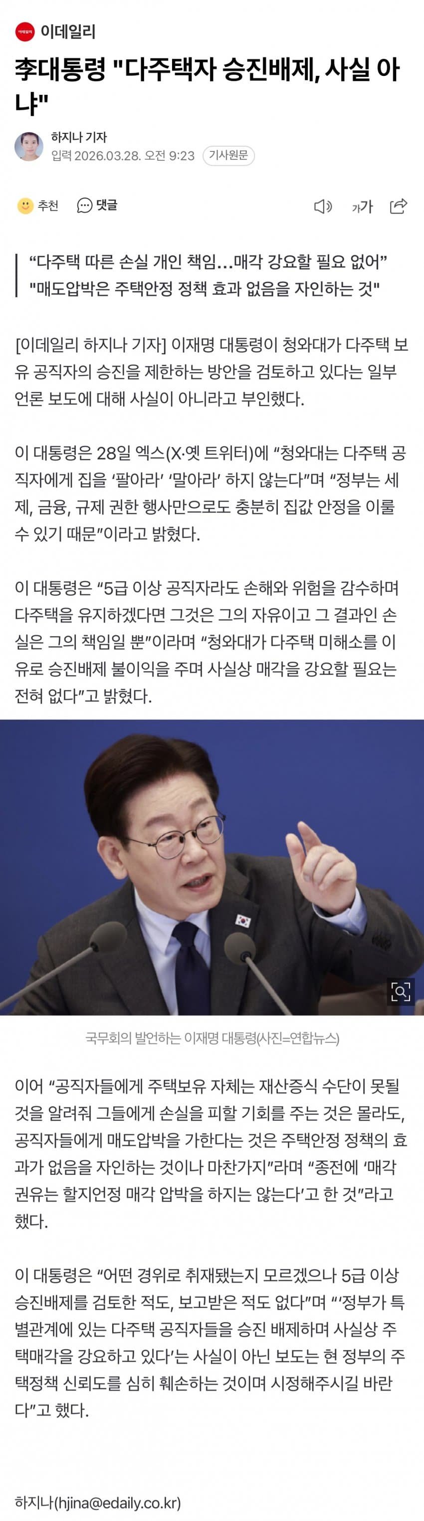 [펌] [이갤] 李대통령 "다주택자 승진배제, 사실 아냐"