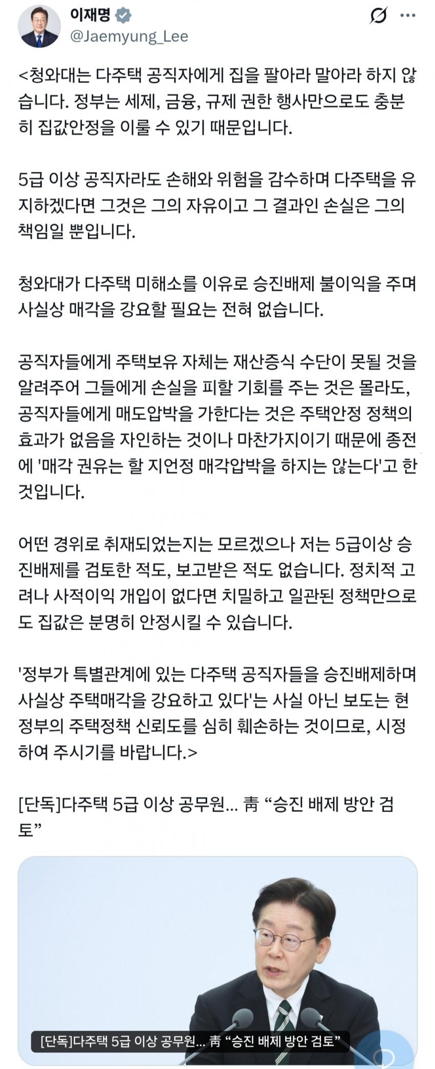 이재명 대통령이 청와대가 다주택 보유 공직자의 승진을 제한하는 방안을 검토하고 있다는 일부 언론 보도에 대해 사실이 아니라고 부인했다. 이 대통령은 28일 엑스(X·옛 트위터)에 “청와대는 다주택 공직자에게 집을 ‘