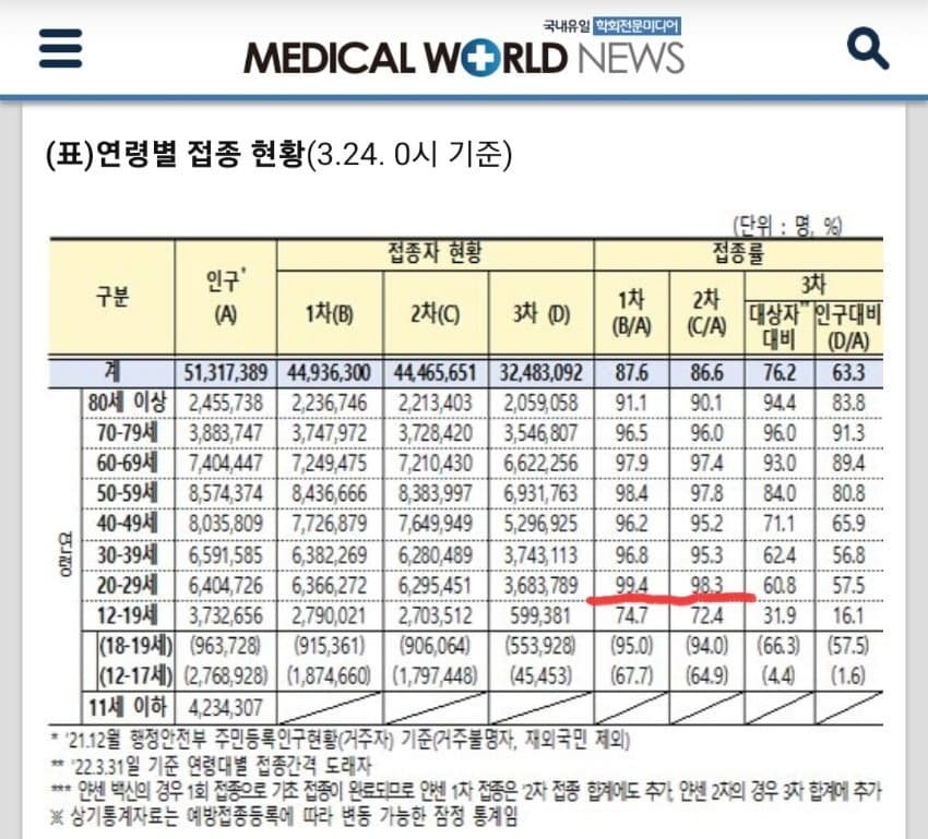 20대 인구 640만중에 636만명인 99.4%가 1차를, 629만명인 98.3%가 2차를 맞음ㄷㄷ 사실상 다맞은셈;;