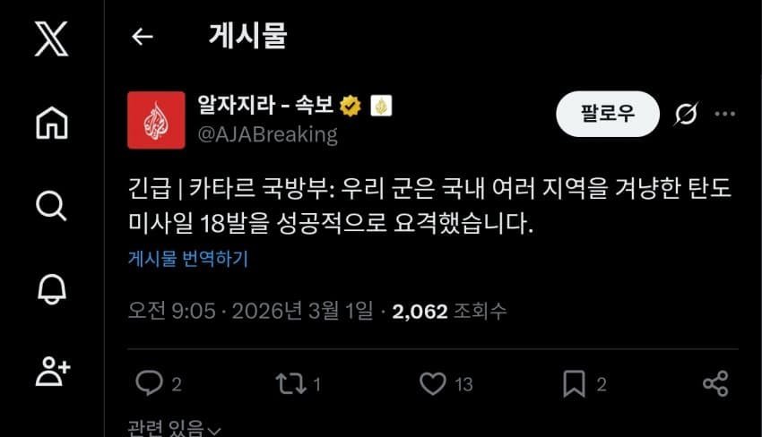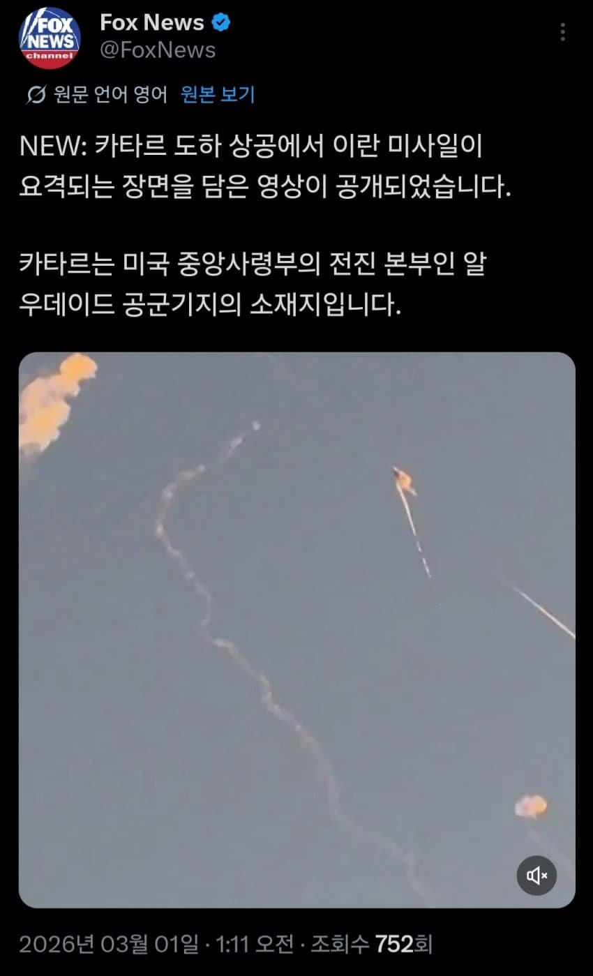 - (속.보) 주카타르 미 공군, "이란 미사일 순조롭게 요격"