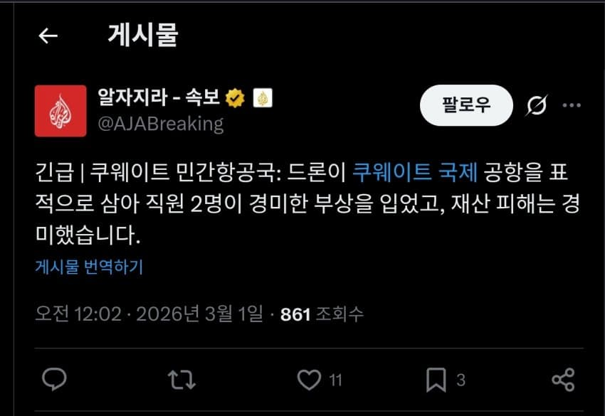 - 알자지라 언론, 쿠웨이트 공항도 이란에 공습받았다 주장.. 2명 부상