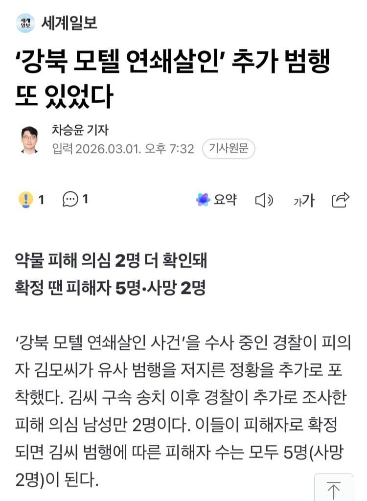 약물 피해 의심 2명 더 확인돼 확정 땐 피해자 5명·사망 2명 ‘강북 모텔 연쇄살인 사건’을 수사 중인 경찰이 피의자 김모씨가 유사 범행을 저지른 정황을 추가로 포착했다. 김씨 구속 송치 이후 경찰이 추가로 조사한