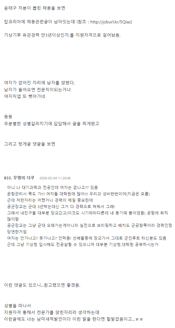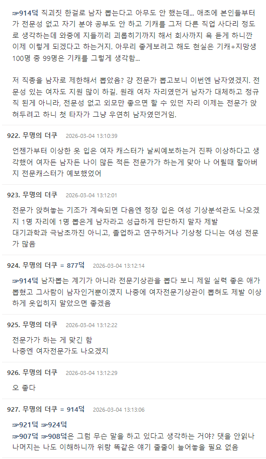 故오요안나님 사건 때문에 기상캐스터가 폐지되고 기상분석관으로 채용된 분이 '남자'라는 이유로 더쿠에서 싸움남ㅋㅋㅋㅋ