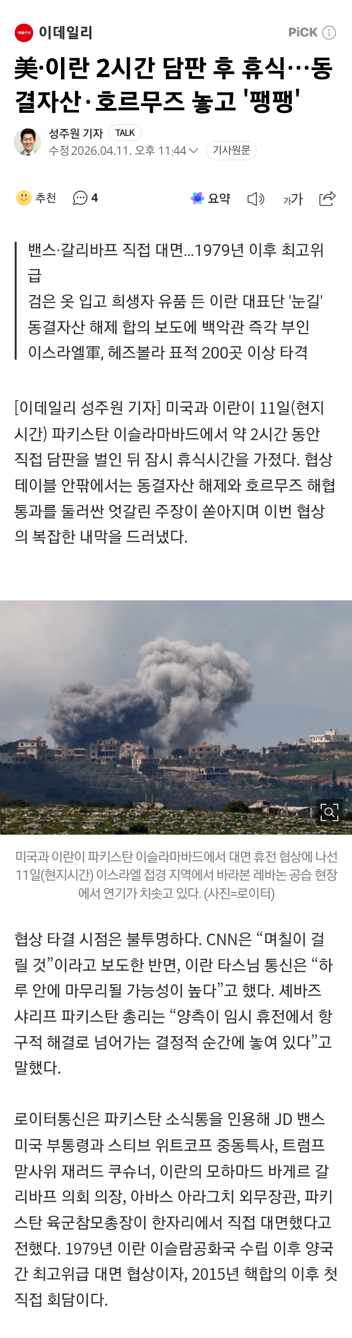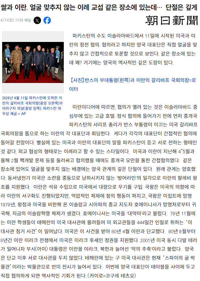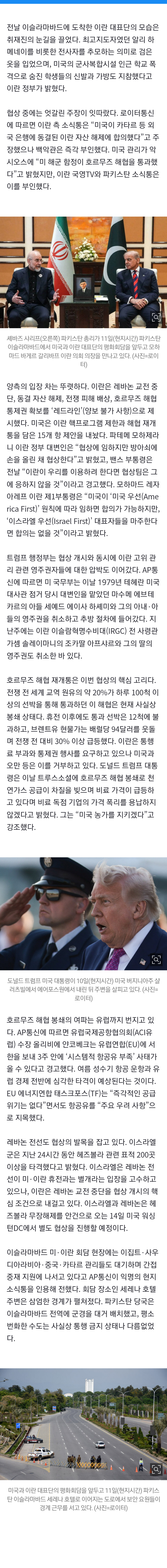 미국과 이란이 11일(현지시간) 파키스탄 이슬라마바드에서 약 2시간 동안 직접 담판을 벌인 뒤 잠시 휴식시간을 가졌다. 협상 테이블 안팎에서는 동결자산 해제와 호르무즈 해협 통과를 둘러싼 엇갈린 주장이 쏟아지며 이번