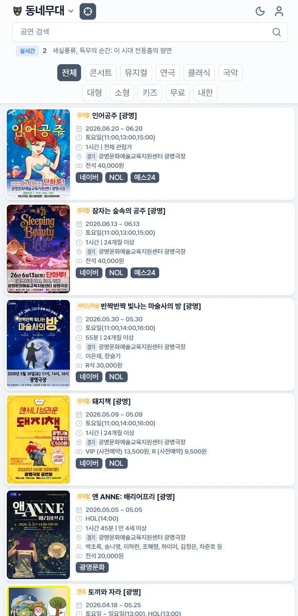 제가 평소에 동네 소극장 연극이나 인디 밴드 공연 보는 걸 참 좋아하거든요. 그런데 주말에 뭐 볼 거 없나 찾아보려면 인터파크, 예스24, 티켓링크에 지자체 홈페이지까지 다 찾아야 하는 게 너무 짜증이 났습니다. (심지어 메인 화면은 맨날 비싼 대형 뮤지컬이 다 차지하고 있고요ㅠㅠ)