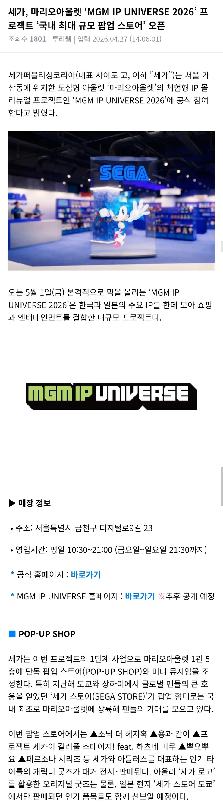 [펌·클리앙] 마리오아울렛에 뜬금없는 세가스토어가 들어오네요