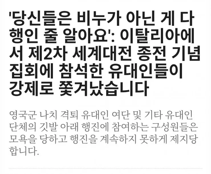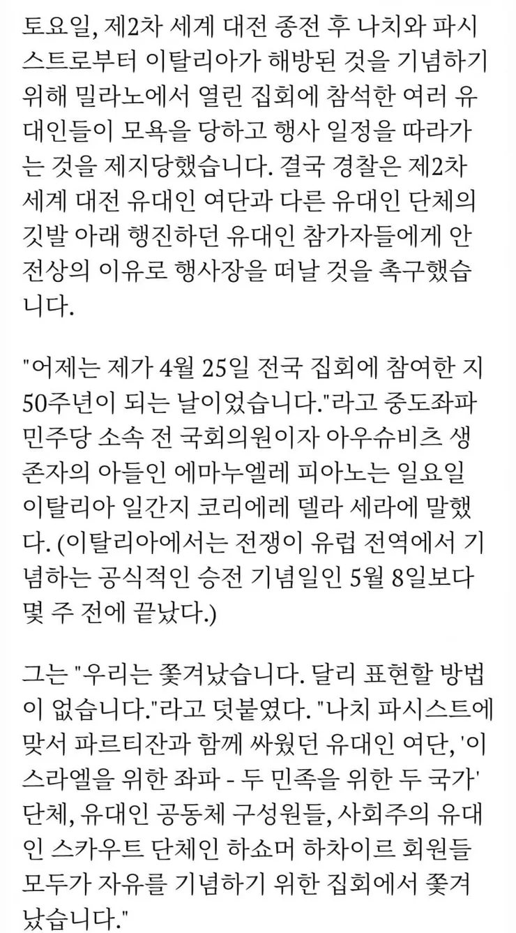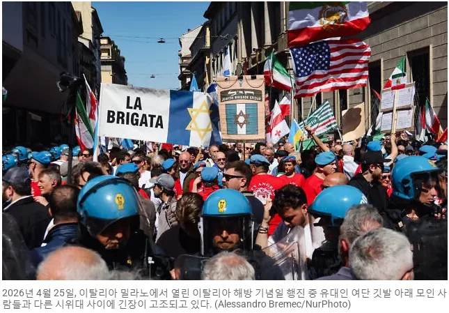 이탈리아 해방 기념 집회에서 유대인 참전단체가 현지 참전단체가 충돌을 일으킴요