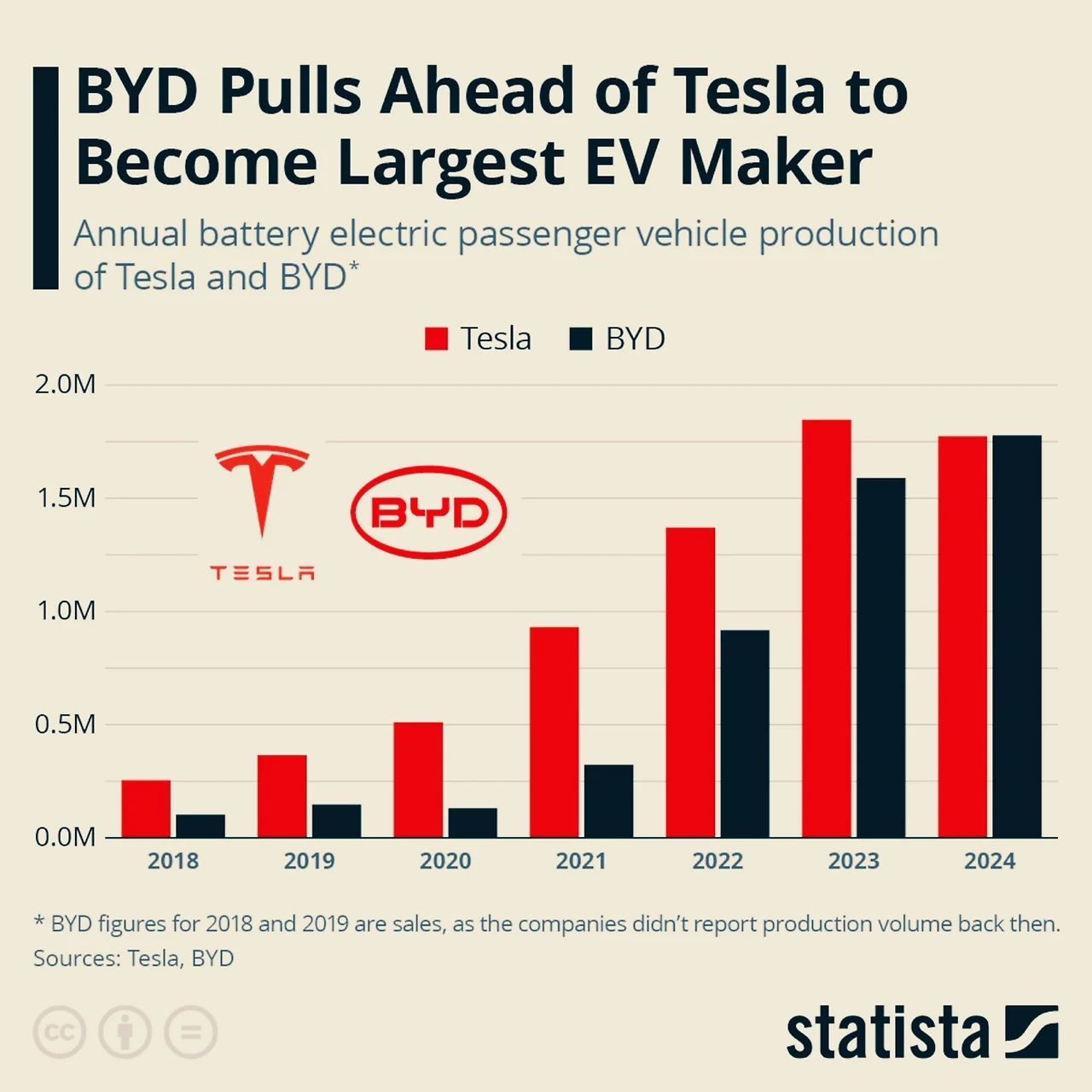 그 결과 2024년에 테슬라 제치고 세계1위 전기차 시장점유 달성, 지금도 테슬라랑 엎치락 뒤치락 하는 중