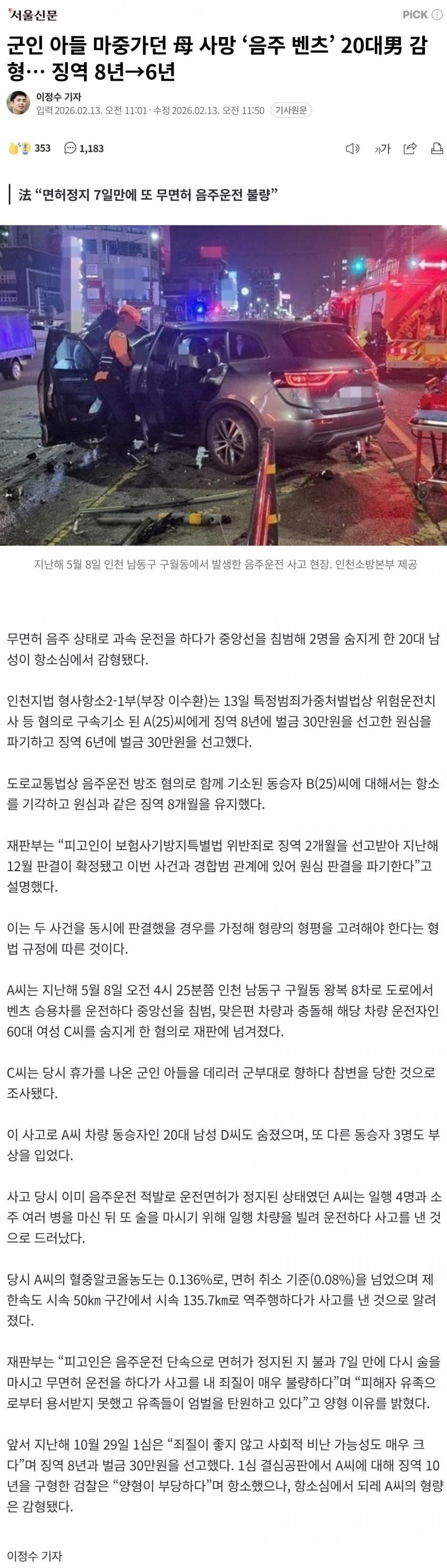 法 “면허정지 7일만에 또 무면허 음주운전 불량” 무면허 음주 상태로 과속 운전을 하다가 중앙선을 침범해 2명을 숨지게 한 20대 남성이 항소심에서 감형됐다. 인천지법 형사항소2-1부(부장 이수환)는 13일 특정범죄