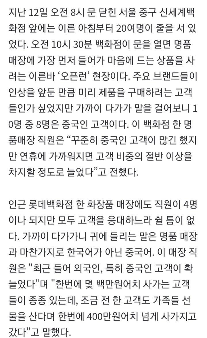 지난 12일 오전 8시 문 닫힌 서울 중구 신세계백화점 앞에는 이른 아침부터 20여명이 줄을 서 있었다. 오전 10시 30분 백화점이 문을 열면 명품 매장에 가장 먼저 들어가 마음에 드는 상품을 사려는 이른바 ‘오픈