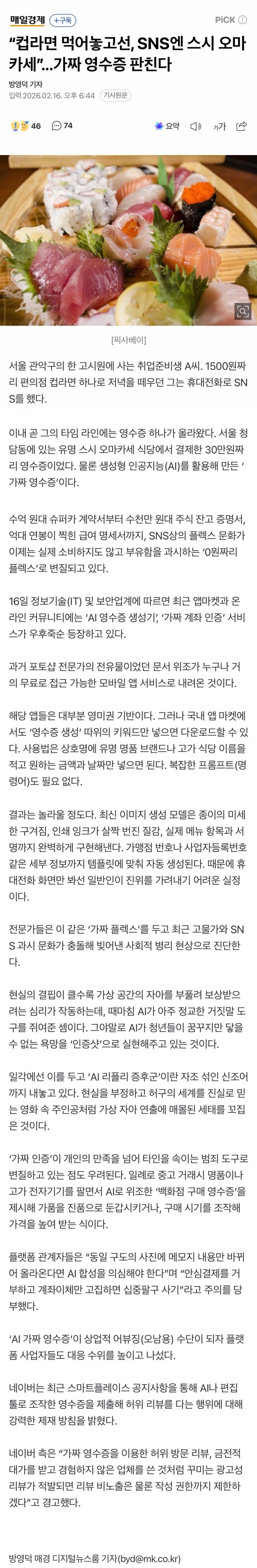 [펌] [야갤] 컵라면 먹어놓고선, SNS엔 스시 오마카세...가짜 영수증 판친다